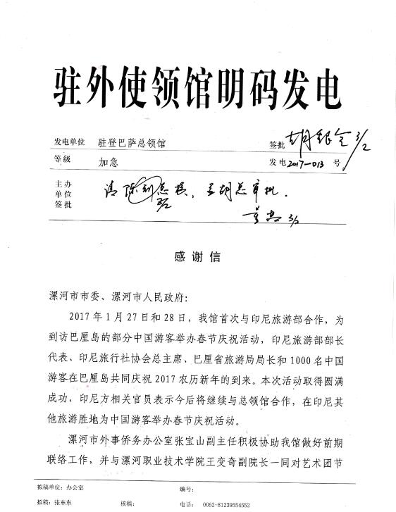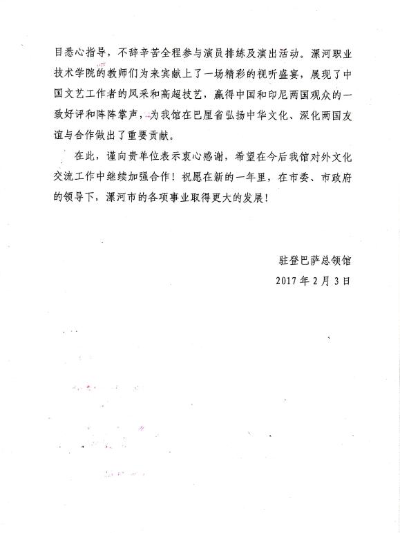 2月3日,中国驻印尼登巴萨总领馆向漯河市委、市政府发来明传电报,表示感谢。感谢信热情洋溢,充分肯定了在副院长王变奇和市外侨办副主任张宝山的带领下,新葡的京集团8814音乐系的教师们在2017年春节期间为巴厘岛献上的精彩视听盛宴,演出展现了中国文艺工作者的风采和高超技艺,赢得了中国和印尼两国观众的一致好评,为总领馆在巴厘省弘扬中华文化、深化两国友谊与合作做出了重要贡献。