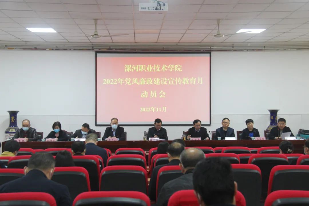 2022年11月16日,新葡的京集团8814在三号教学楼一楼会议室组织召开2022年党风廉政建设宣传教育月动员会,校党委书记易军鹏出席并讲话,校长刘全永主持会议,学校领导班子成员、各职能处室负责人、各院(系)部党总支书记和主任参加会议。