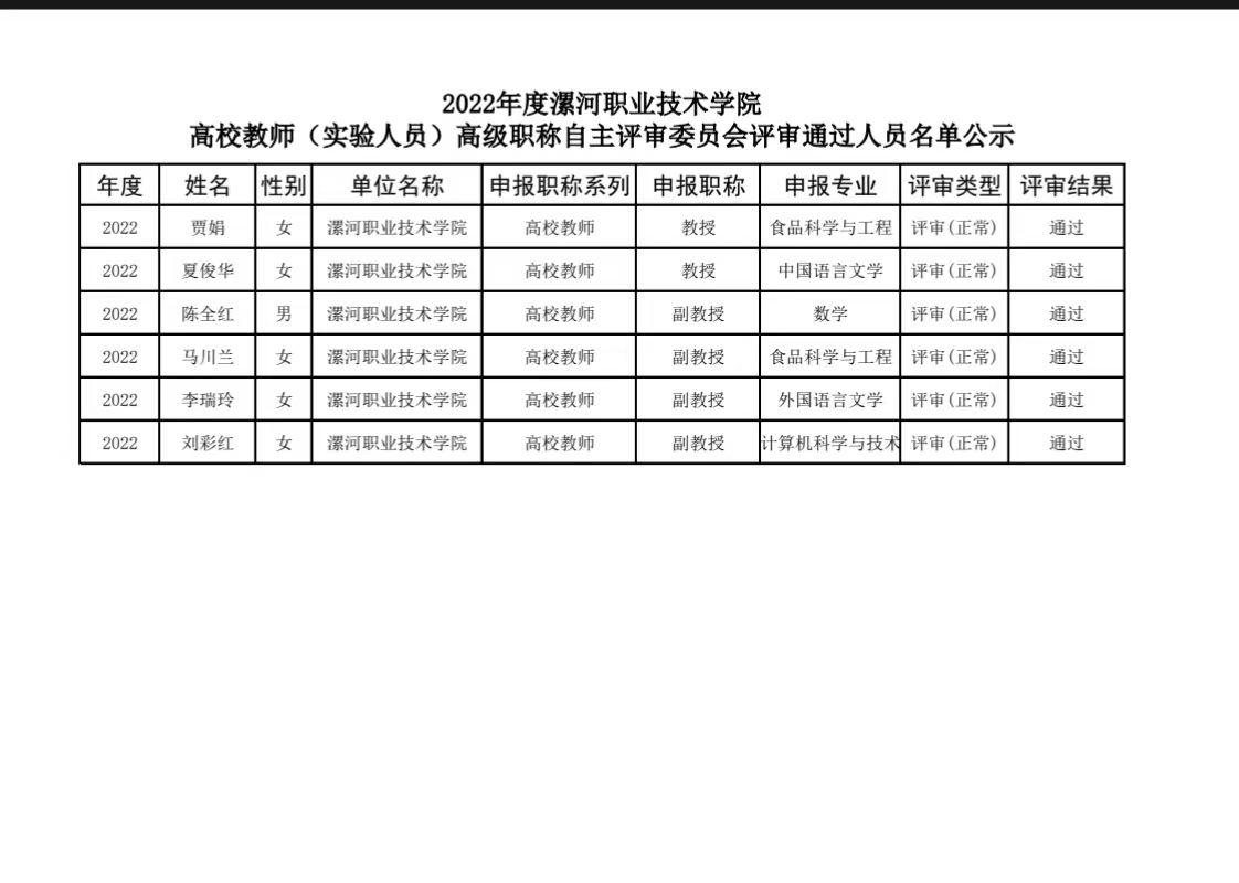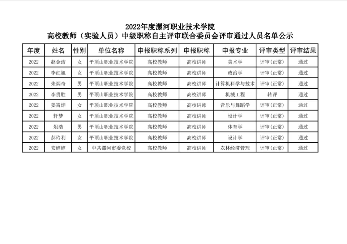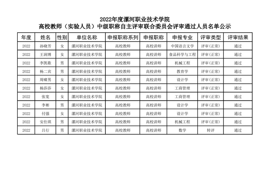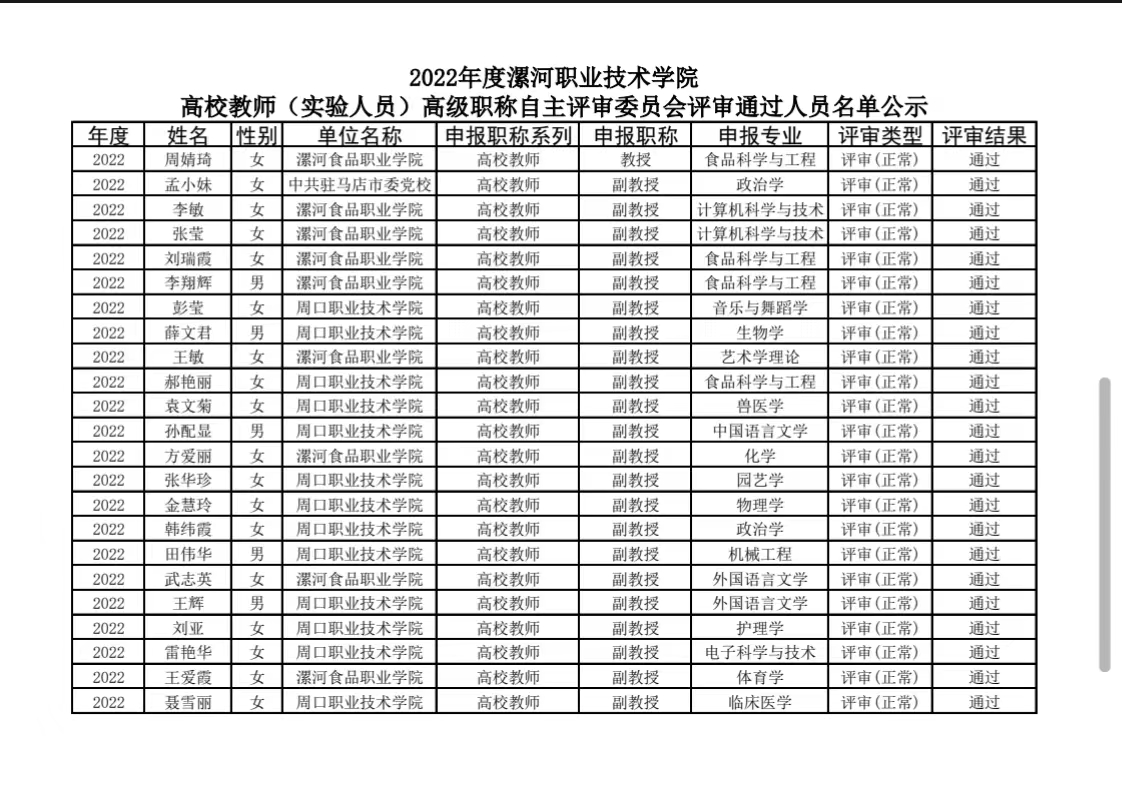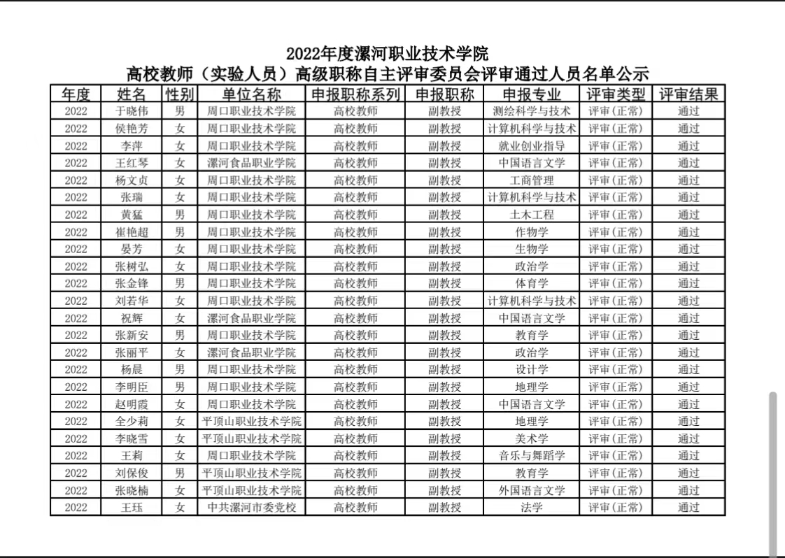 根据2022年省、市职称工作精神,2023年1月10日至11日召开了2022年度新葡的京集团8814高校教师(实验人员)高级职称自主评审委员会和新葡的京集团8814高校教师(实验人员)中级职称自主评审联合委员会,现将评审会承办单位参评人员及受理委托评审人员评审通过结果进行公示,欢迎广大教职工给予监督,如有异议,请向新葡的京集团8814职称评审改革领导小组办公室(下简称漯职院职改办)提出,漯职院职改办将集中复核。