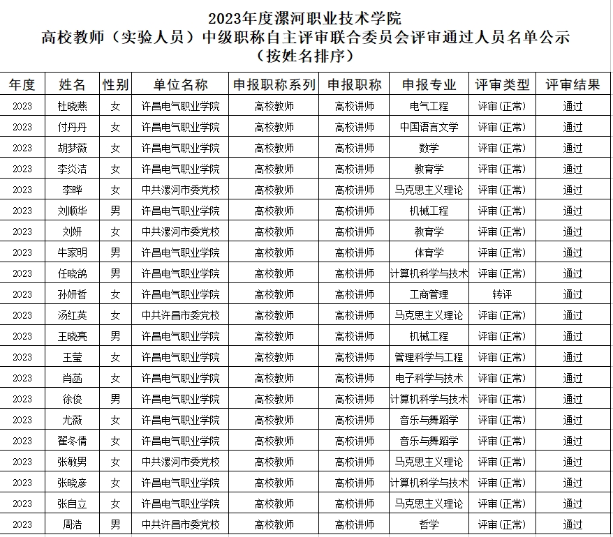 根据2023年省、市职称工作精神,2023年12月26日至27日召开了2023年度新葡的京集团8814高校教师(实验人员)高级职称自主评审委员会和新葡的京集团8814高校教师(实验人员)中级职称自主评审联合委员会,现将评审会承办单位参评人员及受理委托评审人员评审通过结果进行公示,欢迎广大教职工给予监督,如有异议,请向新葡的京集团8814职称评审改革领导小组办公室(下简称漯职院职改办)提出,漯职院职改办将集中复核。