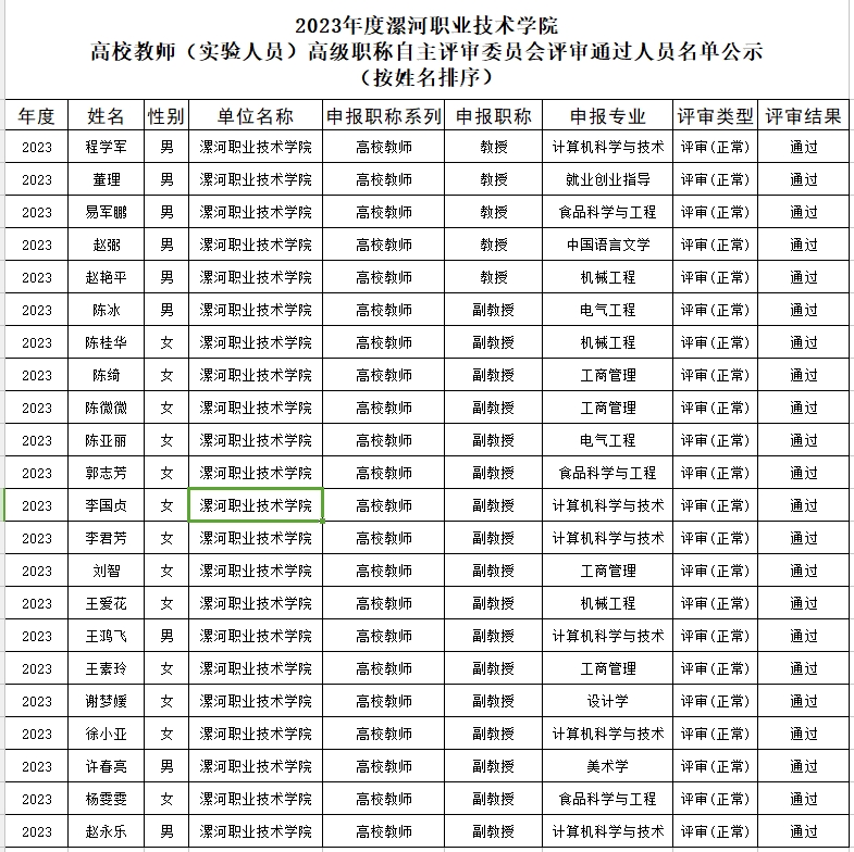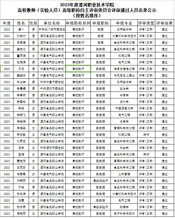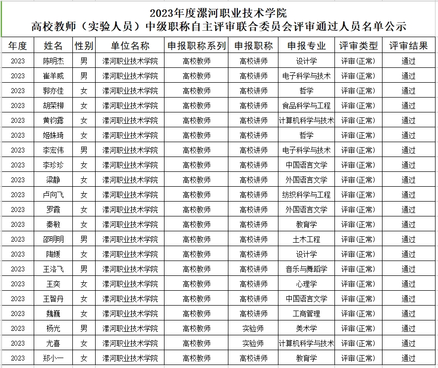 公示内容:2023年度新葡的京集团8814高校教师(实验人员)高级职称自主评审委员会和新葡的京集团8814高校教师(实验人员)中级职称自主评审联合委员会评审结果