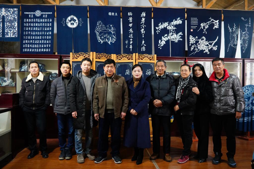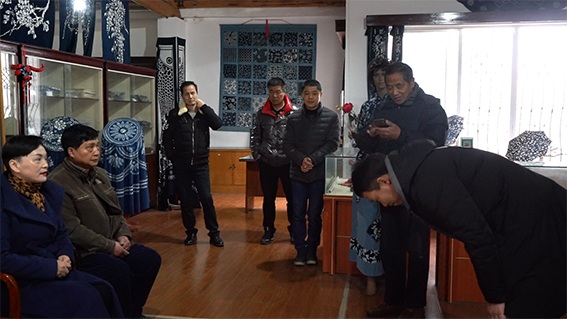 12月31日,为弘扬传统文化,传承非遗国粹,中国扎染艺术大师、我校特聘教授朱辛伟老师,全国青年岗位能手、河南省五四青年奖章获得者、青年剪纸艺术家陈明杰老师一行来到浙江省桐乡市蓝茂丰桐乡蓝印花布厂有限公司艺术馆参加国家级非物质文化遗产代表性项目“蓝印花布印染技艺”拜师仪式。
