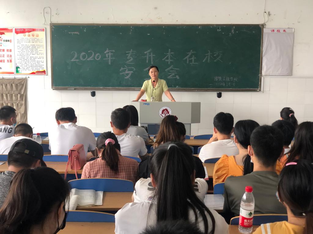 7月1日上午,建筑工程学院在3号楼305教室召开2020届专升本学生返校备考安全会。建筑工程学院院长赵冬梅、副院长姚艳红、党总支副书记李文静、专升本负责老师、毕业班辅导员、宿舍管理老师及83名返校备考学生参加会议,会议由党总支副书记李文静主持。
