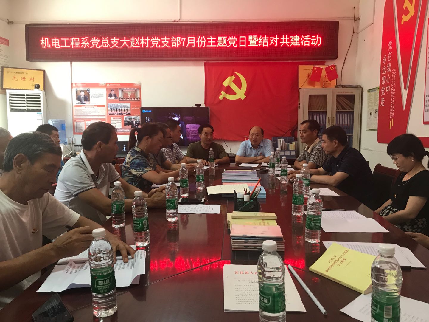 7月10日,机电工程系党总支根据校党委工作安排,和舞阳县莲花镇大赵村党支部在村委会活动室举行“牢记初心使命 争当出彩先锋”主题党日和结对共建活动。来自高校和农村的两个基层党组织在一起开展主题党日活动,大家同唱一首歌,同听一堂党课、共同开展志愿服务行动,既有理论学习,又有实践体验。双方党员面对面交流学习心得,畅谈体会,气氛热烈,本次活动由学校派驻大赵村第一书记朱献周主持。