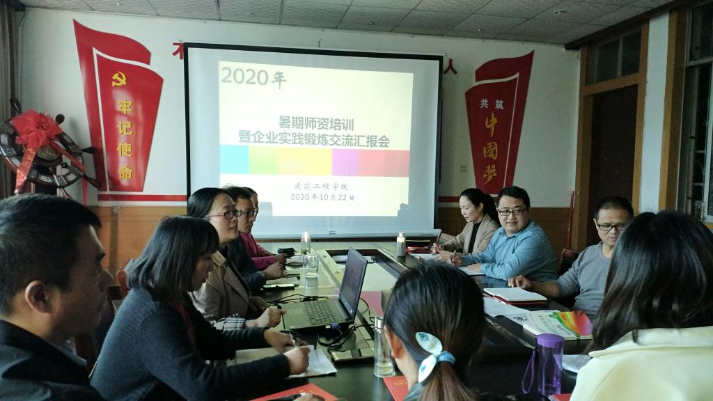 为提升教育教学质量,强化暑期师资培训效果,增强全体教师的业务水平,建筑工程学院首先分教研室进行了校本培训,全体参加师资培训和企业实践的老师都进行了汇报交流。校本培训结束后,10月22日下午,建筑工程学院举办了暑期师资培训暨企业实践锻炼交流汇报会,院长赵冬梅及全体老师参加了会议。会议由每个项目选派的1名优秀教师共5人参加了汇报交流。
