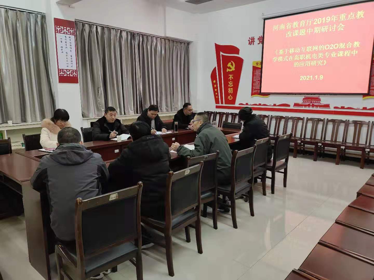 1月9日,我校机电工程系李绍鹏教授主持的河南省重点教改课题“基于移动互联网的O2O混合教学模式在高职机电类专业课程中的应用研究”课题组在机电工程系会议室召开了中期报告研讨会。电气电子工程系主任陈迎松、机电工程系行政负责人赵建功以及课题组骨干成员参加了会议。