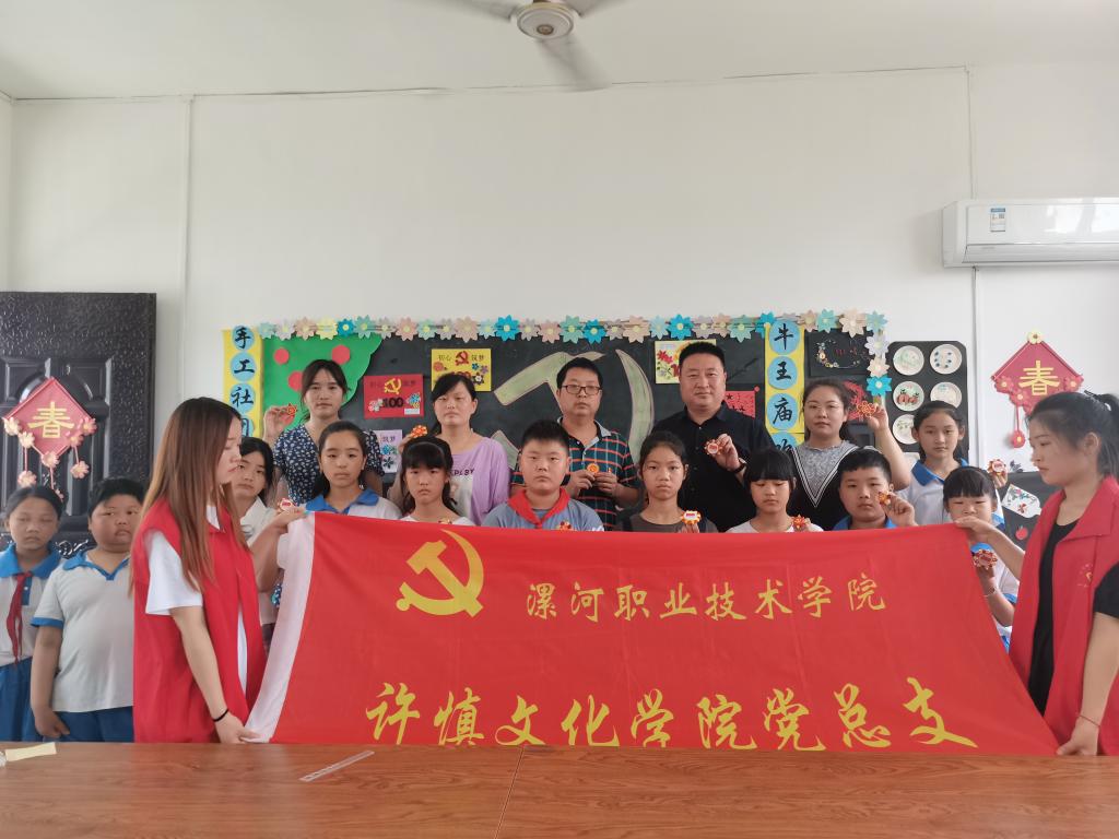 6月2日,许慎文化学院党史教育宣讲志愿服务队在院团总支书记袁海伟的带领下到郾城区李集镇牛王庙小学少年宫开展“宣讲百年党史,手工制作党徽”乡村少年宫支教活动,给少年宫的学生们上了一堂党徽制作示范教学课,用支教帮教的实际行动巩固党史学习成果。