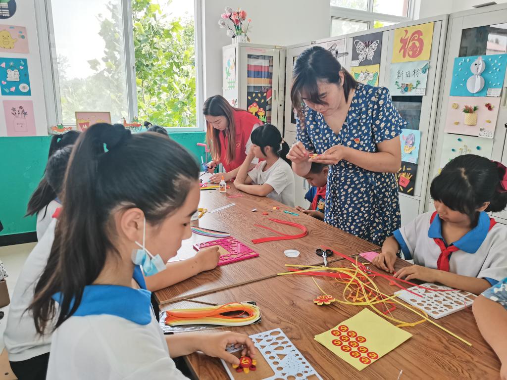 活动伊始,王艳芳老师向同学们讲解中国共产党百年奋斗史和此次手工制作党徽的背景意义。志愿者服务队以党徽制作为支教课堂内容,孩子们悉心聆听,在老师们的指导下认真折纸、粘贴、定型,最后一颗颗红红的党徽成型于每个孩子们灵巧的双手中。