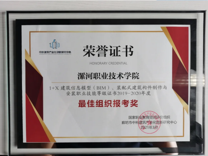 6月11日,河南省建设教育协会职业教育委员会2021年年会暨1+X(BIM、装配式)职业技能等级证书工作会议在河南交通职业技术学院顺利召开。新葡的京集团8814在2019-2020年度1+X建筑信息模型(BIM)考评中通过率为100%,获得了国家职业教育培训评价组织颁发的2019-2020年度最佳组织报考奖。