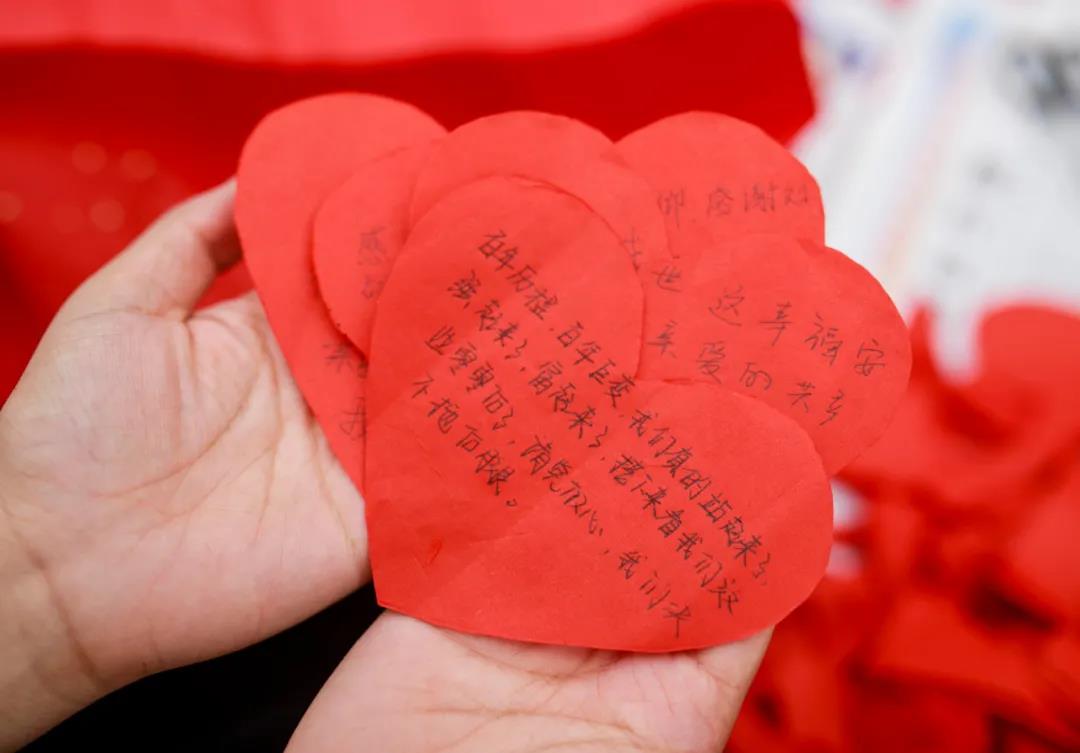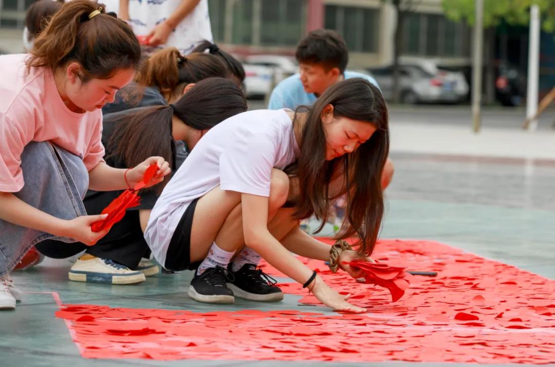 当天上午9点钟,新葡的京集团8814校园内,艺术设计系的20名学子就忙碌起来。大家先用红纸剪出一个个红心,有的同学还拿起笔,在红心上写出发自肺腑的语句。学生王子瑞在红心上写着“这百年盛世,这幸福安康,谢谢您亲爱的共产党,指引着我继续奋发图强”。何雨轩写道“百年历程,百年巨变,我们真的站起来了,强起来了,富起来了,接下来看我们这些零零后了,请党放心,绝不拖后腿。”