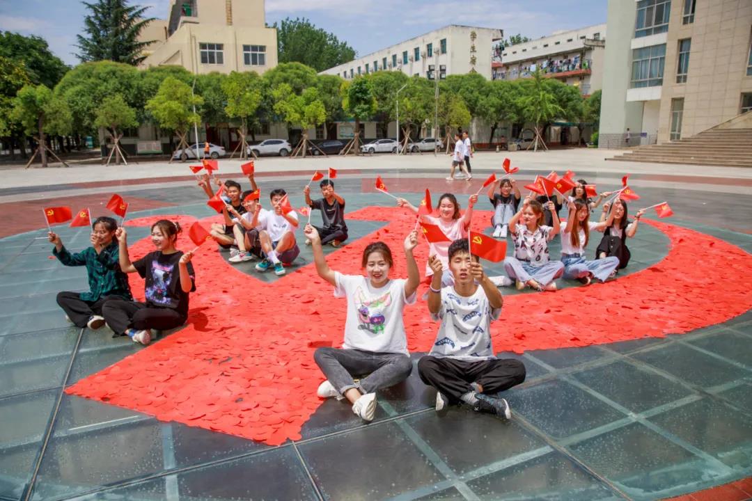 上午10点钟,同学们带着红心,在提前规划好的线框内进行粘贴,一颗颗鲜艳的红心紧密地排列在地面上,逐渐形成了一个巨大的红色党徽。上午11点钟,党徽顺利完成,大家坐在“劳动成果”旁,挥舞着党旗,高唱《歌唱祖国》、《没有共产党就没有新中国》等红色歌曲,嘹亮的歌声在校园回响,幸福的笑容在同学们脸上洋溢。
