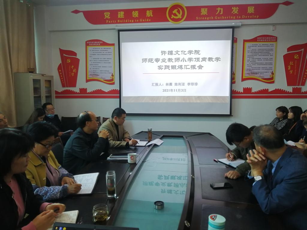 11月3日,许慎文化学院召开师范专业教师小学顶岗教学实践锻炼汇报会,林薇、陈利亚、李珍珍等三名教师分别从顶岗学校基本情况、现场观摩、课堂执教、交流研讨、收获总结等几个方面进行总结汇报。