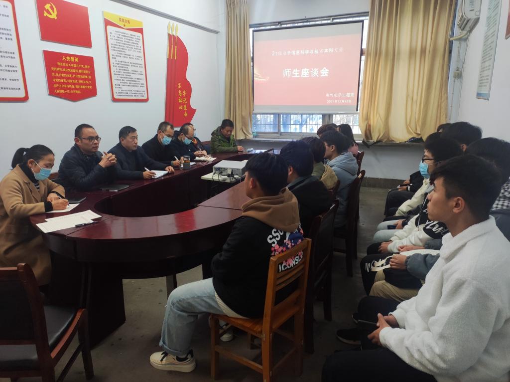 12月15日,电气电子工程系召开了电子信息科学与技术(本科)专业师生座谈会。师生代表齐聚一堂、畅所欲言,分享学习体会与感受,对学校发展建言献策。系主任陈迎松、党支部书记齐伟民、副主任陈冰以及全体教研室老师、2021级本科生代表参加了座谈会。会议由陈冰主持。