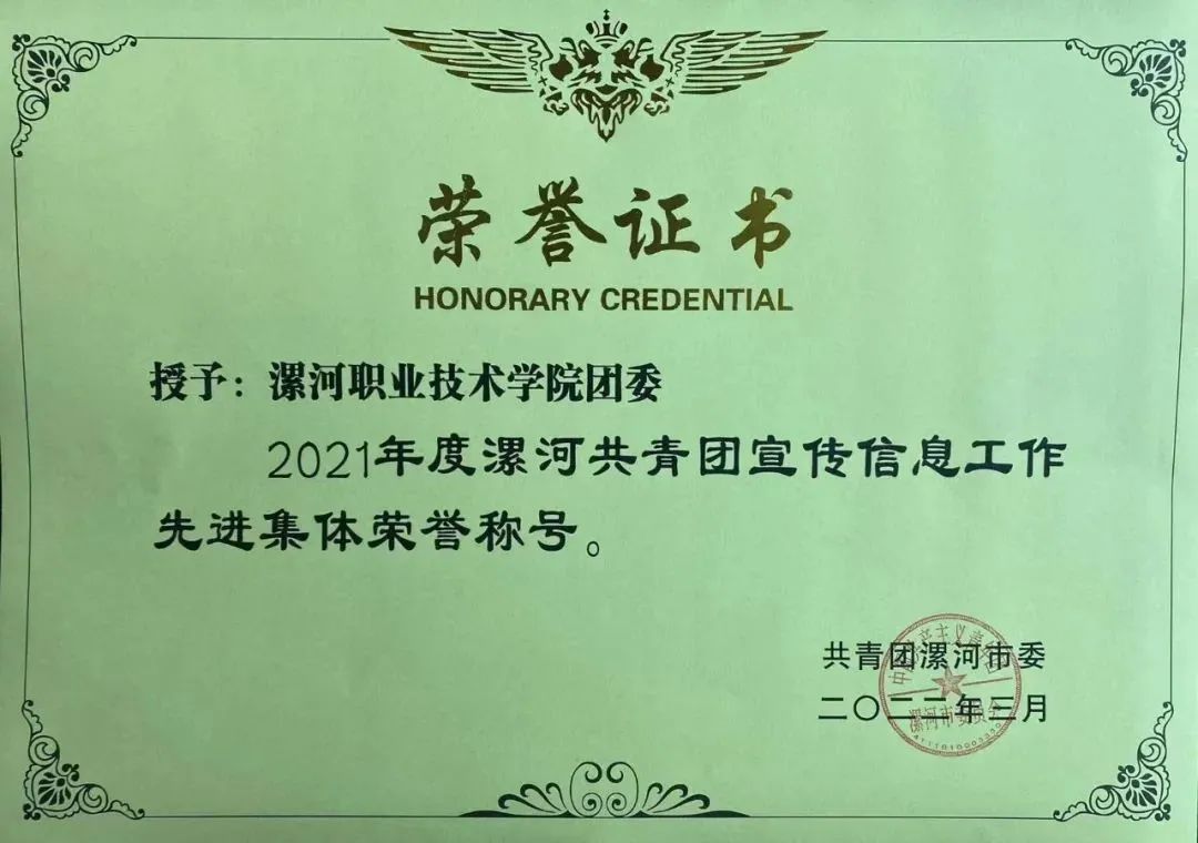 近日,共青团漯河市委印发了《关于表彰2021年度全市共青团宣传工作先进集体和先进个人的通报》,新葡的京集团8814团委荣获“2021年度漯河共青团宣传信息工作先进集体”称号;校团委周茜、李方媛老师荣获“2021年度漯河共青团宣传信息工作先进个人”称号;思想政治理论部李诚诚、郭亦佳老师,艺术设计系陈明杰老师荣获“2021年度漯河青年讲师团宣讲工作先进个人”称号;音乐舞蹈系赵新慧老师、旅游与航空学院胡世恒老师荣获“2021年度漯河共青团红色文艺轻骑兵进基层慰问演出先进个人”称号。