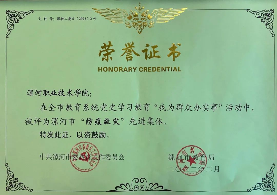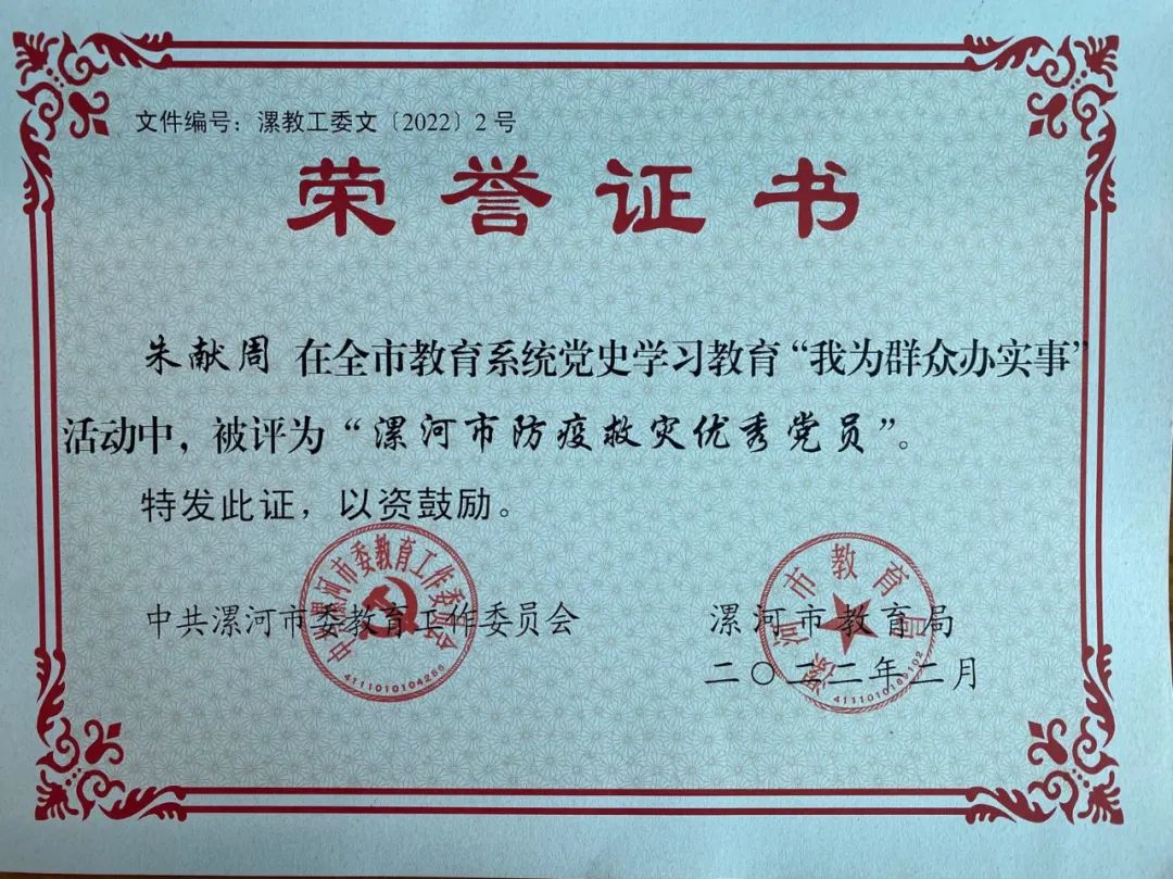近日,漯河市委教育工委、漯河市教育局印发《关于表彰党史学习教育“我为群众办实事”先进典型的通知》(漯教工委文﹝2022﹞2号),新葡的京集团8814荣获“防疫救灾”先进集体,朱献周同志荣获“漯河市防疫救灾优秀党员”。