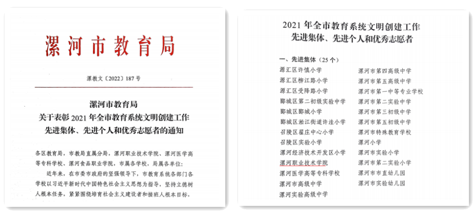 近日,漯河市教育局下发《关于表彰2021年全市教育系统文明创建工作先进集体、先进个人和优秀志愿者的通知》(漯教文〔2022〕187号),新葡的京集团8814荣获2021年全市教育系统文明创建工作先进集体。安仕琪老师、王鑫荣老师荣获优秀志愿者称号。一年来,学校坚持把文明创建工作作为一项全局性、基础性、战略性工作摆在重要位置,以习近平新时代中国特色社会主义思想为指导,以社会主义核心价值观为引领,坚持立德树人根本任务,紧紧围绕培育社会主义建设者和接班人根本目标,以学生思想道德建设和文明校园创建为抓手,细化工作方案,狠抓教育引导、制度建设、志愿服务等关键环节,全校师生齐心协力、攻坚克难,文明素质和校园文化得到显著提升。