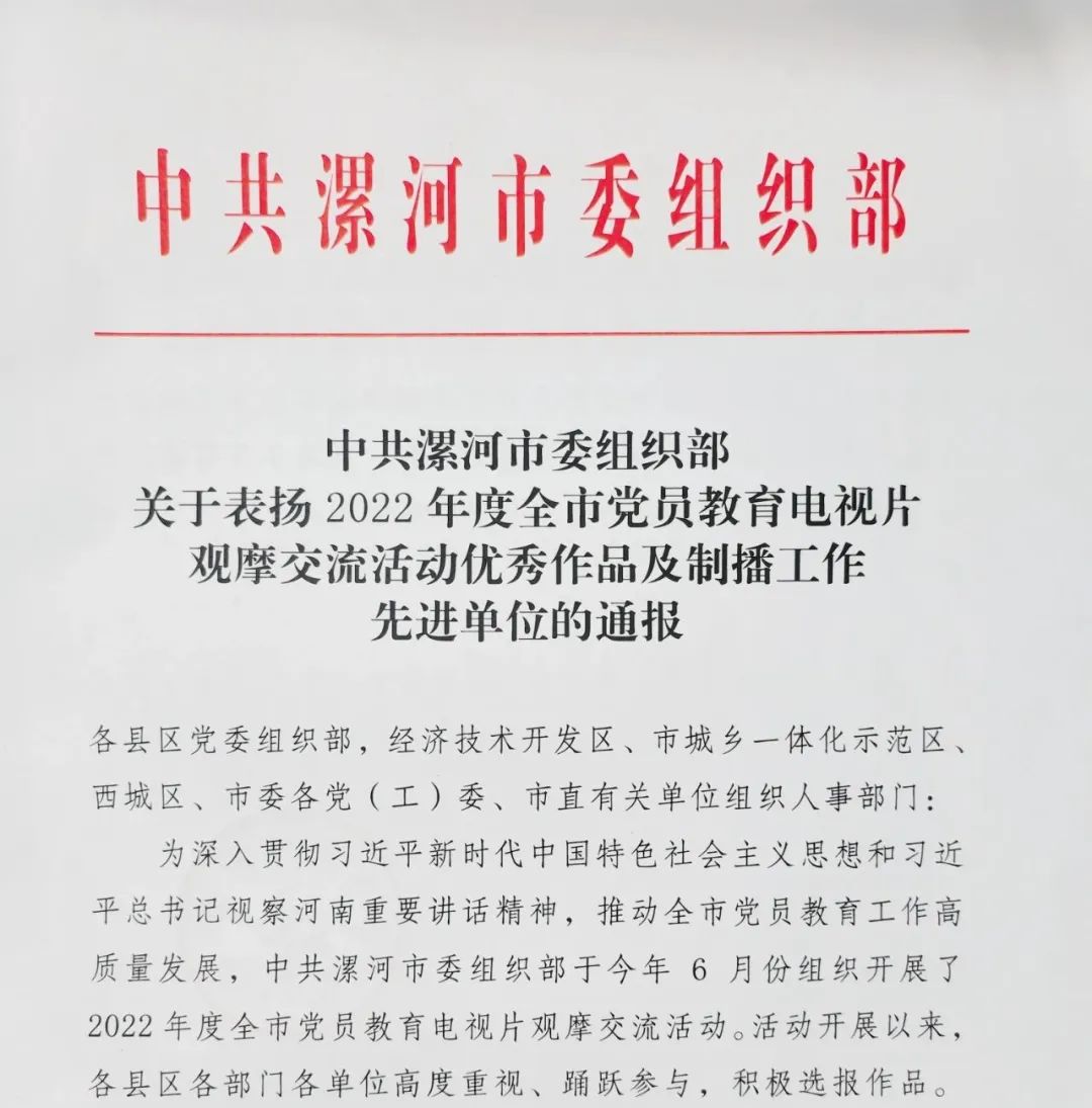 近日,中共漯河市委组织部下发《关于表扬2022年度全市党员教育电视片观摩交流活动优秀作品及制播工作先进单位的通报》,新葡的京集团8814荣获全市党员教育电视片制作工作先进单位,选报作品《坚守》荣获一等奖,《信仰》荣获优秀奖,《党在我心中》荣获优秀党课。