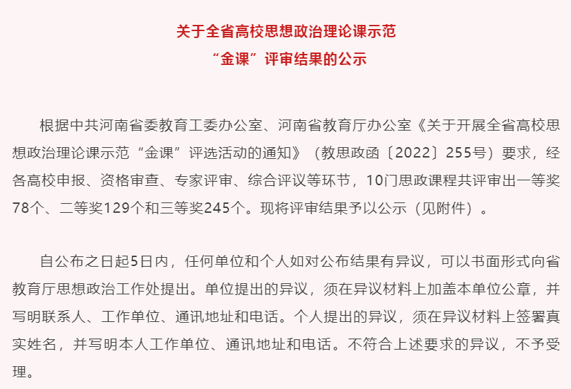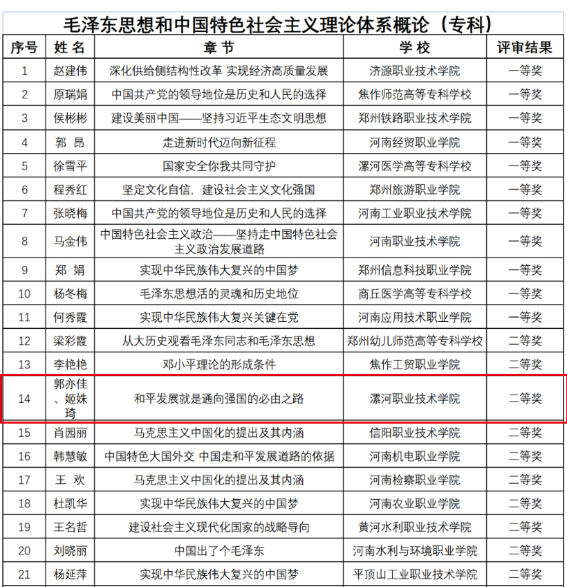 近日,中共河南省委教育工委办公室、河南省教育厅办公室下发《关于开展全省高校思想政治理论课示范“金课”评选活动的通知》(教思政函〔2022〕255号)要求,经各高校申报、资格审查、专家评审、综合评议等环节,新葡的京集团8814思想政治理论部郭亦佳、姬姝琦两位老师报送的《和平发展就是通向强国的必由之路》获得《毛泽东思想和中国特色社会主义理论体系概论》专科组二等奖。