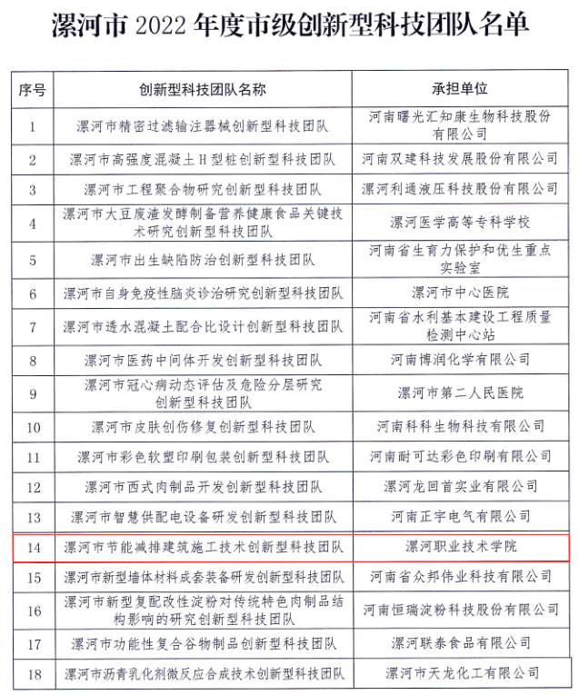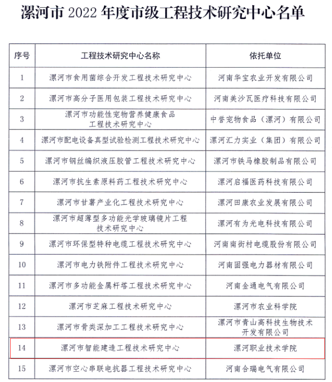 近日,漯河市科技局下发了《关于认定(建设)2022年度市级高新技术企业、孵化载体、工程技术研究中心、中试基地、技术转移示范机构、创新型科技团队、农业科技园区、重点实验室的通知》(漯科〔2022〕49号),我校申报的“漯河市智能建造工程技术研究中心”和“漯河市节能减排建筑施工技术创新型科技团队”成功获批。