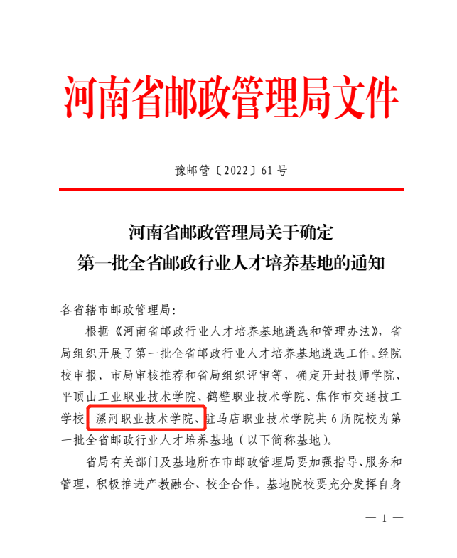 近日,河南省邮政管理局下发《关于确定第一批全省邮政行业人才培养基地的通知》(豫邮管〔2022〕61号),经过院校申报、市局审核推荐、省局组织评审等环节,我校获批河南省第一批邮政行业人才培养基地。