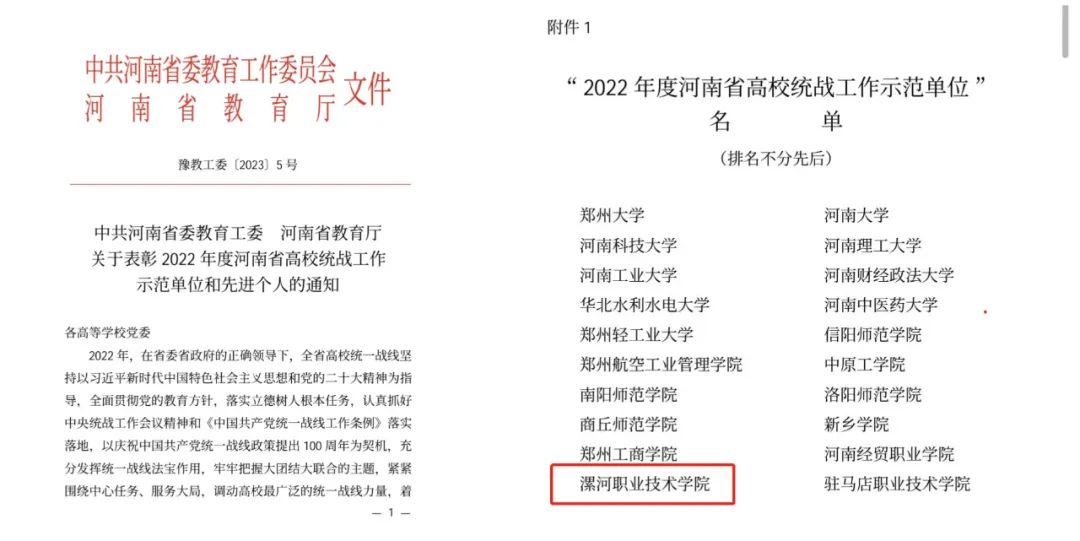 近日,中共河南省委教育工委、河南省教育厅下发《关于2022年度河南省高校统战工作示范单位和先进个人的通知》(豫教工委〔2023〕5号),我校荣获“2022年度河南省高校统战工作示范单位”称号,此项荣誉的获得是省委教育工委、省教育厅对我校统战工作的充分肯定,也是我校扎实工作、奋力拼搏的成果。