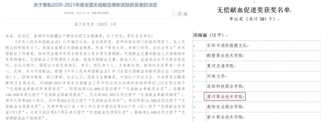 2月14日,国家卫生健康委员会与中国红十字会总会、中央军委后勤保障部卫生局联合下发《关于表彰2020-2021年度全国无偿献血表彰奖励获奖者的决定》(国卫医急发〔2023〕3号),新葡的京集团8814荣获“全国无偿献血促进奖”,成为漯河市获此殊荣的唯一一家单位。