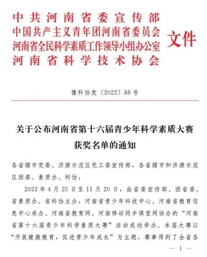 近日,河南省第十六届青少年科学素质大赛成绩揭晓,新葡的京集团8814成绩优异,荣获“优秀组织奖”;樊佩佩、马华阳、吴亚凭、谢孟哲等老师荣获“优秀辅导奖”;理晶、员佳婷同学荣获“大学组一等奖”;范力萌、张奕轩、祝豪杰、王汝莹荣获“大学组二等奖”;吴丰岐、丁振丹、石畑畑、王若惜、王雨鑫同学荣获“大学组三等奖”。