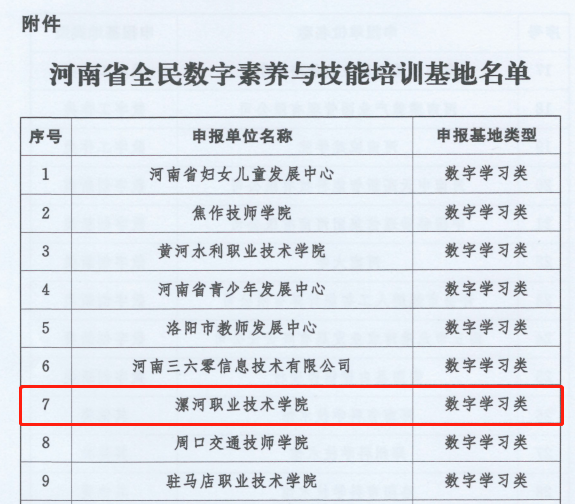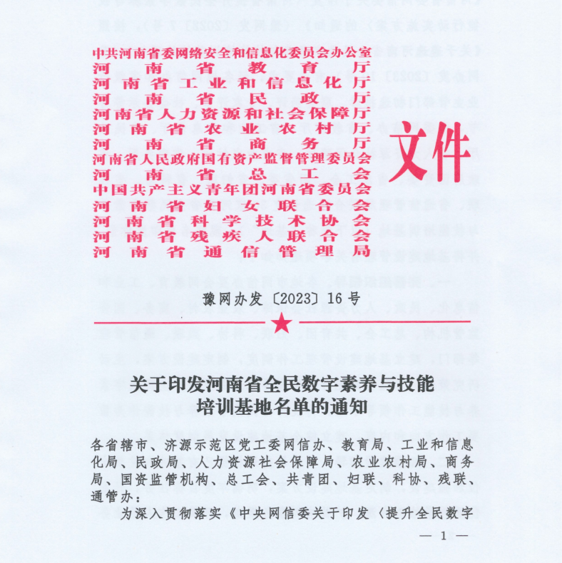近日,由省委网信办、省教育厅、省工业和信息化厅、省民政厅、省人力资源社会保障厅、省农业农村厅、省商务厅、省政府国资委、省总工会、团省委、省妇联、省科协、省残联、省通信管理局等14个部门下发《关于印发河南省全民数字素养与技能培训基地名单的通知》(豫网办发〔2023〕16号),经各市初选推荐、专家评审、部门审核和公示等环节,联合评选出数字生活类、数字工作类、数字学习类、数字创新类和其他类全民数字素养与技能培训基地30家单位,新葡的京集团8814成为我市唯一入选高校。