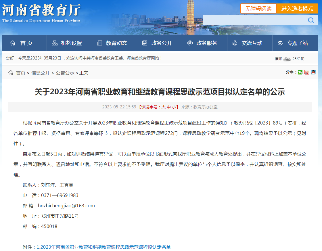 5月22日,河南省教育厅办公室公布了《关于2023年河南省职业教育和继续教育课程思政示范项目拟认定名单的公示》,新葡的京集团88144门课程入选河南省职业教育和继续教育课程思政示范课程,入选示范课程相应授课教师、团队被认定为河南省职业教育与继续教育课程思政教学名师和教学团队。