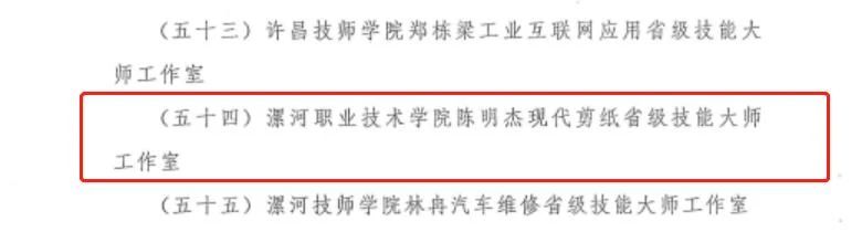 近日,河南省人力资源和社会保障厅发布了《河南全民技能振兴工程领导小组关于公布2023年河南全民技能振兴工程建设项目名单的通知》 (豫技领〔2023〕1号),我校成功申报省级高技能人才培养示范基地项目,陈明杰现代剪纸省级技能大师工作室成功申报省级技能大师工作室建设项目。