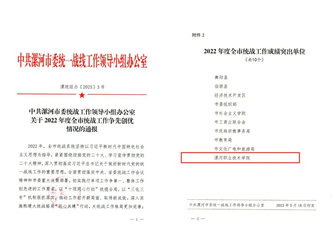 近日,中共漯河市委统一战线工作领导小组办公室下发《关于2022年度全市统战工作争先创优情况的通报》(漯统组办〔2023〕3号),新葡的京集团8814在全市统战系统中脱颖而出,被评为全市统战工作成绩突出单位。