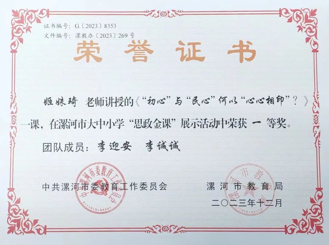 为深入推进大中小学思政课一体化建设,打造一批高水平思政“金课”,漯河市委教育工委、漯河市教育局组织开展了2023年全市大中小学“思政金课”展示活动。近日,从《中共漯河市委教育工作委员会、漯河市教育局关于公布全市大中小学“思政金课”展示活动结果的通知》(漯教办〔2023〕269号)获悉,经过激烈角逐,新葡的京集团8814马克思主义学院姬姝琦老师讲授的《“初心”与“民心”何以“心心相印”》荣获一等奖,田蕊老师讲授的《党的自我革命永远在路上》荣获优秀奖。