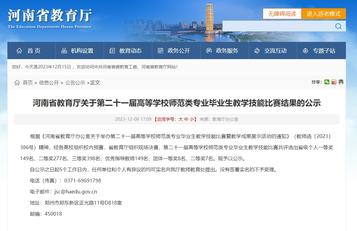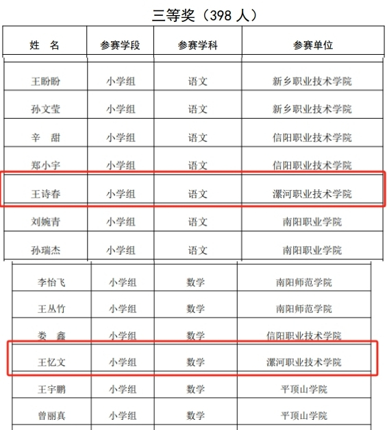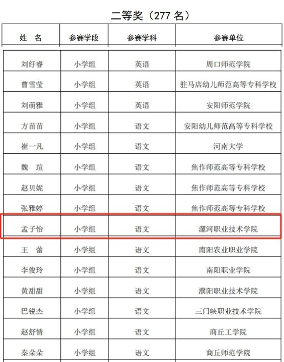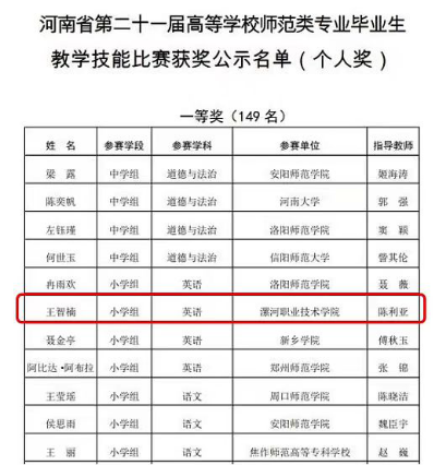 近日,河南省教育厅发布《第二十一届高等学校师范类专业毕业生教学技能比赛结果的公示》,新葡的京集团8814应用外语与国际教育系学生王智楠(指导老师陈利亚)荣获小学英语学科一等奖,孟子怡、王诗春(指导老师孙晓芳、赵鑫彦)荣获小学语文学科二等奖和三等奖,王忆文(指导老师秦敏)荣获小学数学学科三等奖。