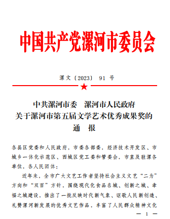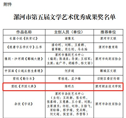 市文学艺术优秀成果奖是漯河市文化艺术界的最高奖项,是激励我市文艺创作、践行“文化点亮城市”的重要载体平台。陈明杰现代剪纸工作室是河南省级技能大师工作室,是学院建设品牌项目、打造非遗传承基地的重要载体。剪纸作品《开国大典》是以思政教育为元素开展的文艺创作,弘扬了唱响主旋律,传递真善美,弘扬正能量的时代主题。
