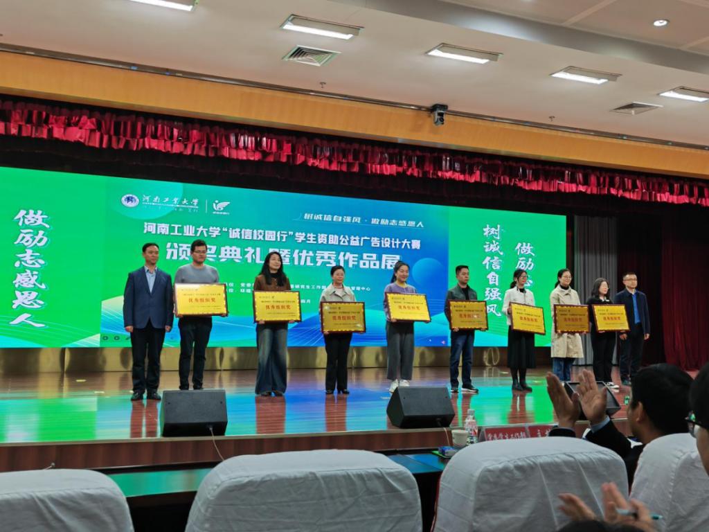 近日,河南工业大学“诚信校园行”学生资助公益广告设计大赛颁奖典礼暨优秀作品展在河南工业大学D303报告厅举行,河南省教育厅学生资助中心主任戴晓明、河南工业大学党委副书记黄泽峰、河南工业大学团委书记高泉等领导出席活动,并为获奖学生和单位颁奖。漯河工学院在该项大赛中表现优异,荣获平面设计类一等奖2项,二等奖3项,三等奖1项,整体荣获优秀组织奖。