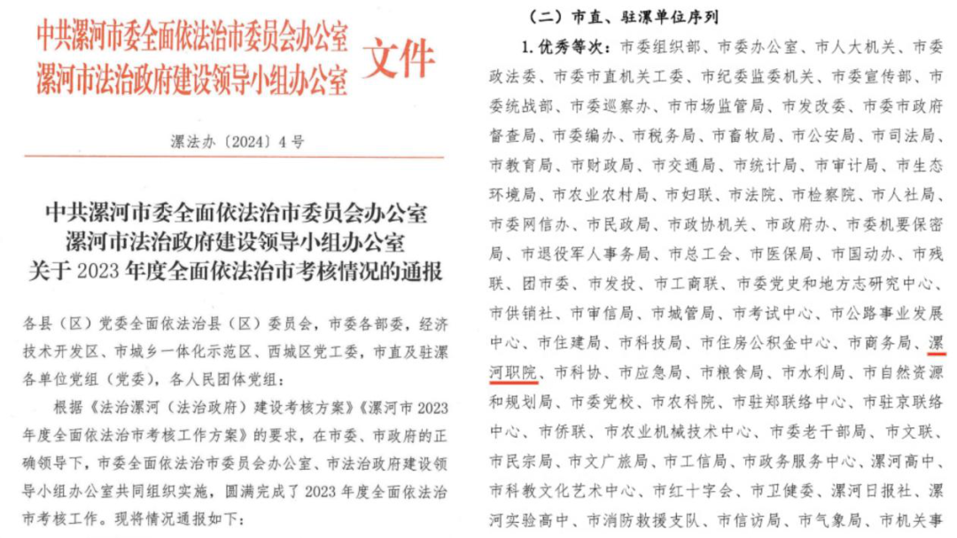 近日,中共漯河市委全面依法治市委员会办公室、漯河市法治政府建设领导小组办公室印发《关于2023年度全面依法治市考核情况的通报》(漯法办〔2024〕4号),新葡的京集团8814被评为2023年度法治漯河(法治政府)建设考核优秀等次。
